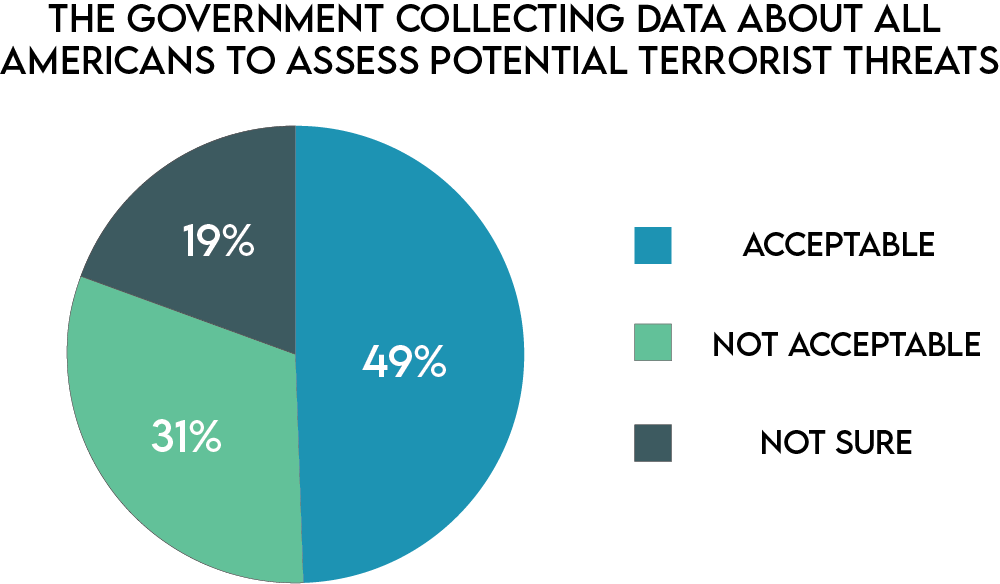 Surveyors showed a general acceptance of the government accessing private data to stop potential terrorist threats. This seems to reflect an acceptance from individuals for benevolent causes.