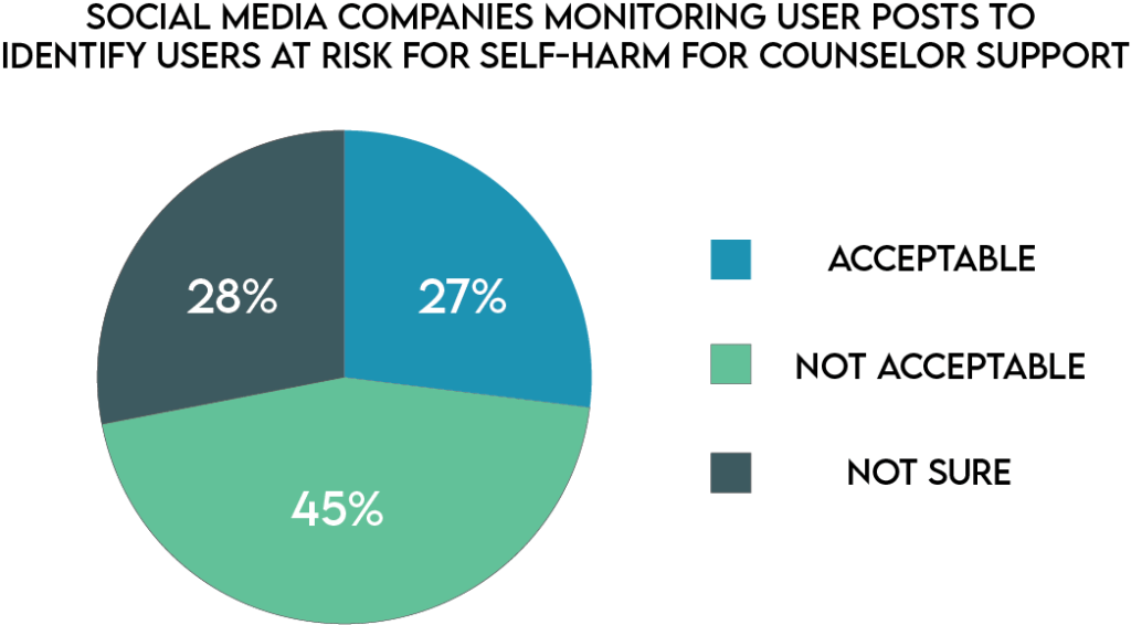 As shown by the data below, there is a varying degree of acceptability in terms of private data collection. The approval or disapproval of private data collection is dependent on who is collecting the data and the reason the data is being collected. The survey responses show overall disapproval of data collection, even if the data is being collected for benevolent reasons such as suicide prevention or law enforcement. Individuals have and desire their right to their own privacy.