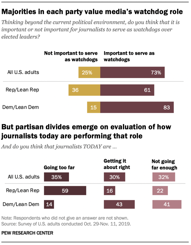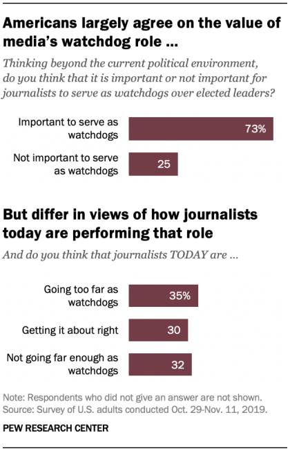 Atske, S. (2020, August 18). Most say journalists should be watchdogs, but views of how well they fill this role vary by party, media diet. Pew Research Center’s Journalism Project. Retrieved April 13, 2023, from https://www.pewresearch.org/journalism/2020/02/26/most-say-journalists-should-be-watchdogs-but-views-of-how-well-they-fill-this-role-vary-by-party-media-diet/