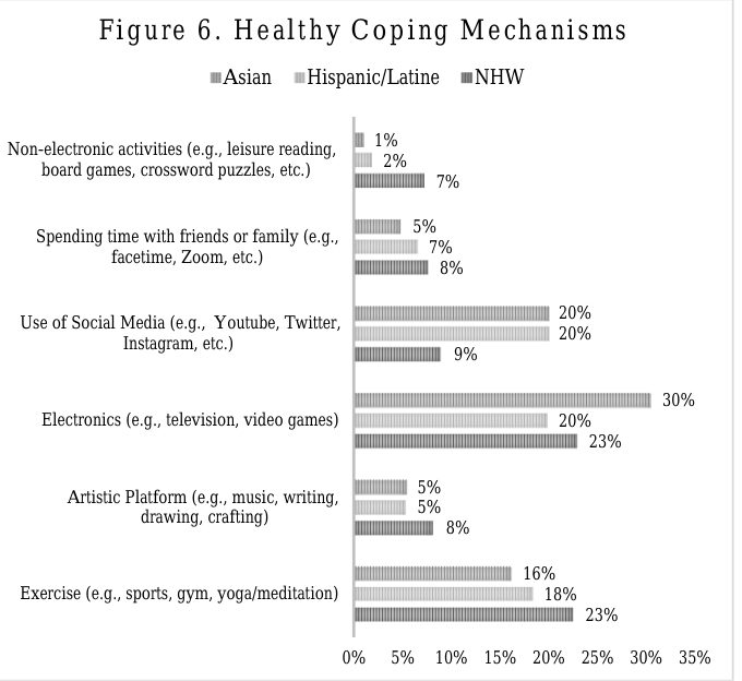 During an interview, Eric stated that they had anticipated mental health to be overall poor and the rates of everything to be high. They also expected exercise to be the top healthy coping exercise, but to their surprise, it was watching TV and streaming shows on Netflix. Furthermore, excessive use of alcohol was found to be the top unhealthy coping method for Latina and white students, while the use of cannabis was higher than expected.