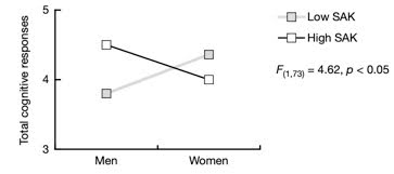 FIGURE 2 TOTAL COGNITIVE RESPONSES AND SELF-ASSESSED KNOWLEDGE BY GENDER INTERACTION