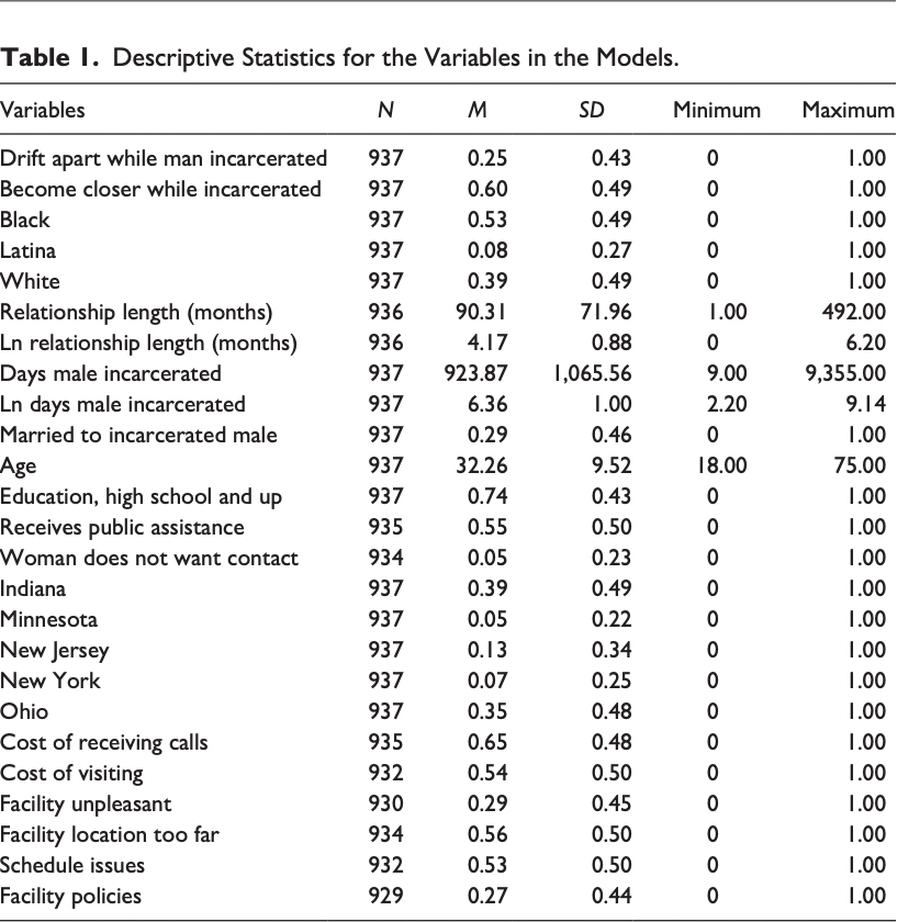 The experiment was conducted using a Likert Scale survey. The first question asked was if the incarceration of their husbands changed their relationship with each other. A four-point scale was used where one meant strongly agree, and four meant strongly disagree. After that, the questions turned into two-point scales, in which the responses were either Agree or Disagree. The objective of these two-point questions was to see if things such as the distance of the prison, visitor admission rules, the cost of visitation, the association of seeing their husbands in prison, and scheduling conflicts were factors that prevented these women from seeing their husbands, therefore affecting their relationships. Dr. Durante stated during our interview that, for the most part, the hypotheses showed a direct correlation to women feeling like their relationships with their incarcerated husbands were drifting apart. However, the one exception to this was that the cost of the visitation was not as significant of a factor as anticipated. Instead, the cost of phone calls was seen as a much more significant barrier. There was no correlation between the cost of visitation and relationship conditions.